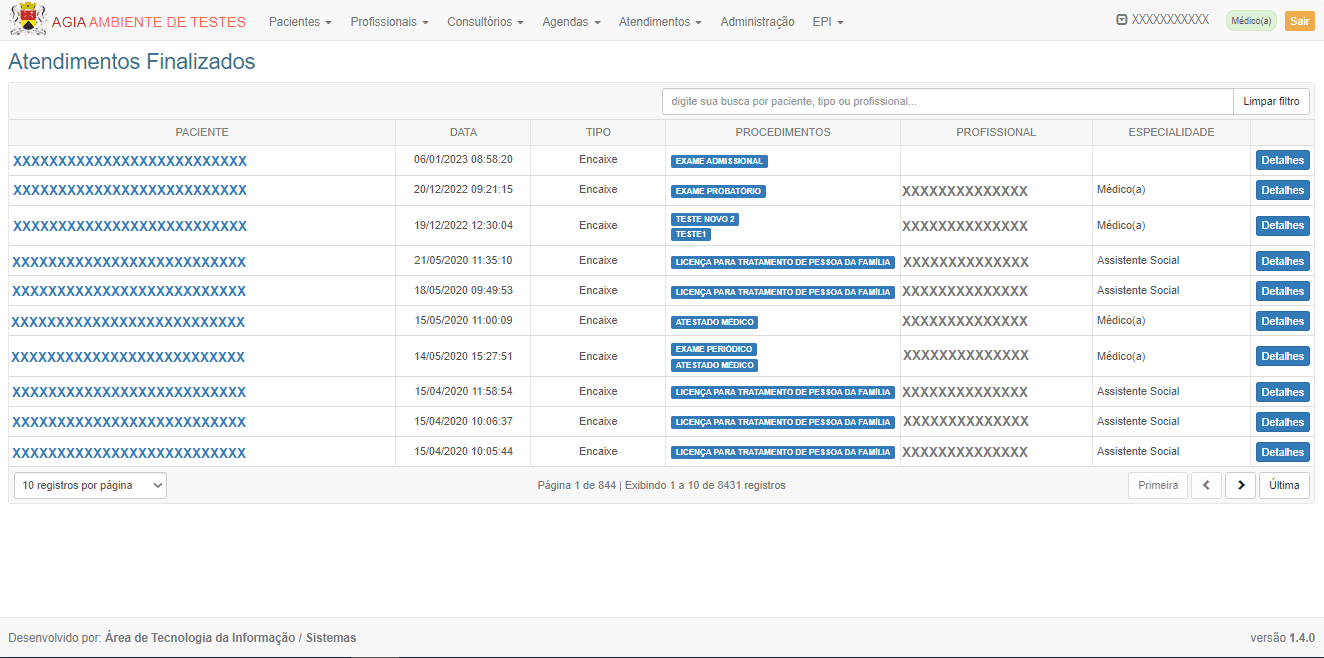 Na área de atendimentos finalizados, há como verificar quem foi o profissional responsável por aquele atendimento, além de possibilitar verificar os detalhes sobre um atendimento em específico. Também é possível pesquisar os atendimentos por paciente, tipo de atendimento e profissional.