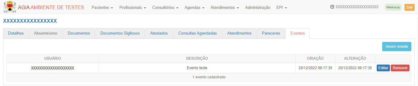 Nesta seção serão registradas observações sobre eventos ocorridos com o funcionário, tal como um acidente de trabalho. Para incluir, clique no botão Inserir evento para descrever o ocorrido. Para cada Evento registrado, fica gravado também o usuário que fez sua inclusão, assim como a data e hora de criação e última alteração. Um Evento somente poderá ser alterado ou removido pelo usuário que o cadastrou.