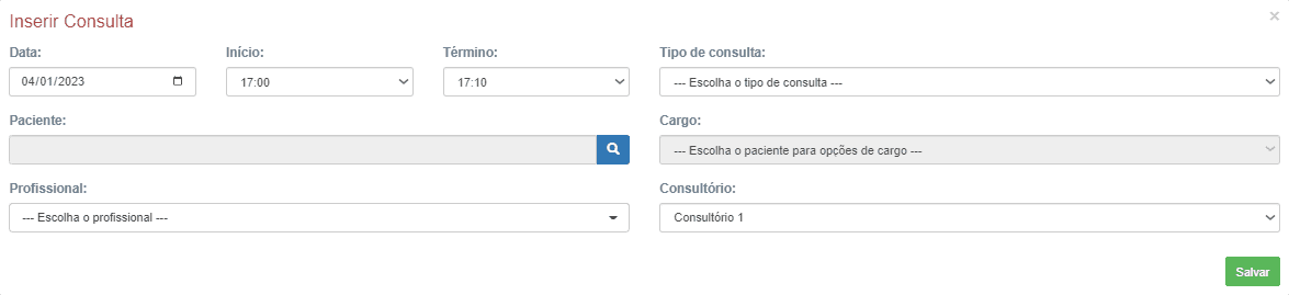 Para inserir uma nova consulta, clique em um horário que esteja disponível para assim poder criar um agendamento. A seguinte tela será exibida contendo os campos necessários para o agendamento de uma nova consulta:
