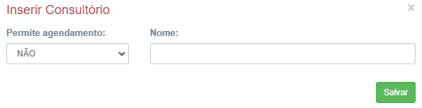 Para inserir um consultório, clique no botão Inserir do menu Consultórios ou no botão Inserir consultório dentro da listagem. No caso de um consultório já cadastrado que não será mais utilizado no sistema, clique nele e altere o campo Permite agendamento: para NÃO.