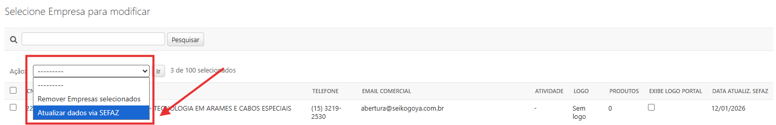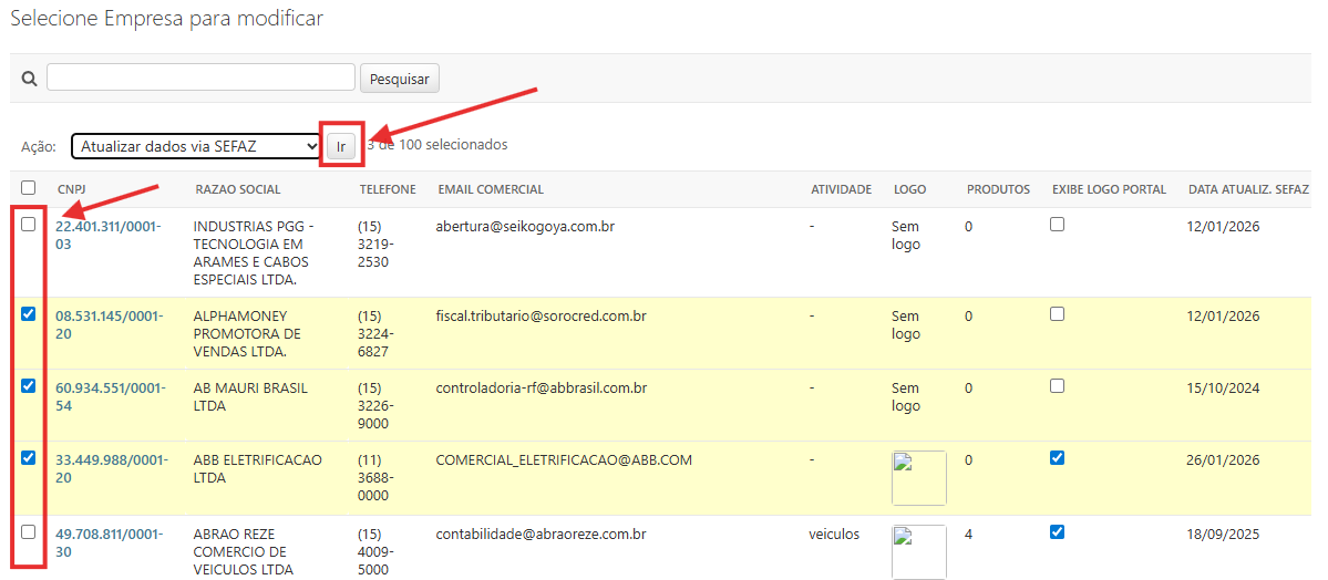 Selecione as empresas que deseja atualizar as informações e clique em ‘ir’.