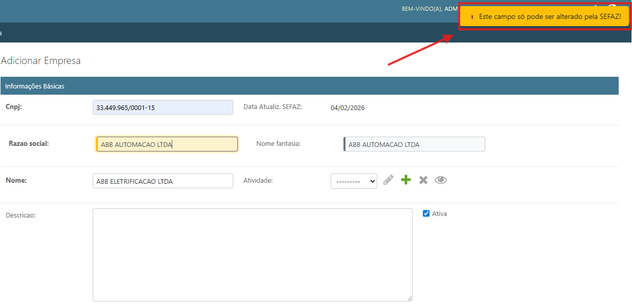 Imagem 32 - cadastro de empresas - mensagem de atualização dos dados via SEFAZ.
