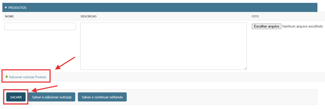 Clique na opção ‘adicionar outro(a) Produto’ e informe os dados do produto.