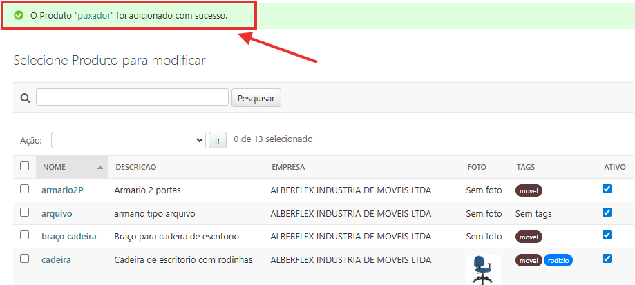 Imagem 35 - cadastro de produtos - mensagem de sucesso