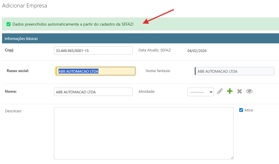 Caso o CNPJ exista no sistema da SEFAZ, as seguintes informações serão inicializadas: