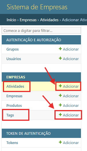Para cadastro de empresas, clique na opção ‘adicionar’ no menu inicial.