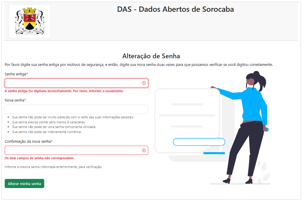 Caso a senha anterior esteja errada ou a confirmação da nova senha não esteja correta, uma mensagem de erro será exibida.
