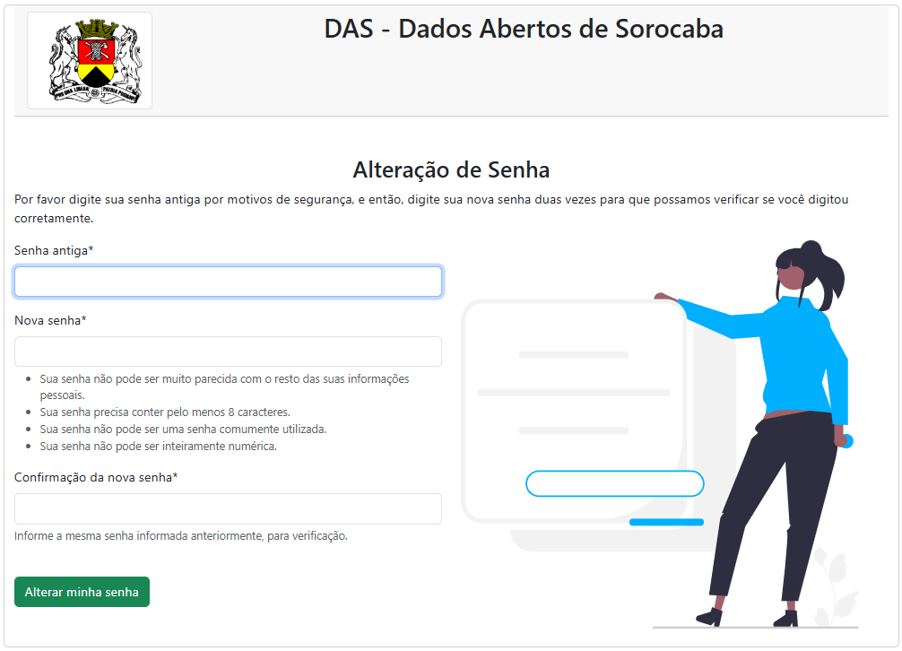 No site, informe a nova senha, confirme a nova senha e clique no botão ‘Alterar minha senha’.