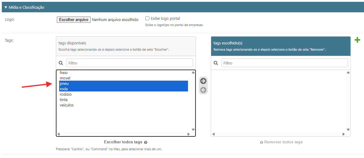 Para selecionar mais de uma tag, pressione a tecla ‘CTRL’ e clique nas tags desejadas.