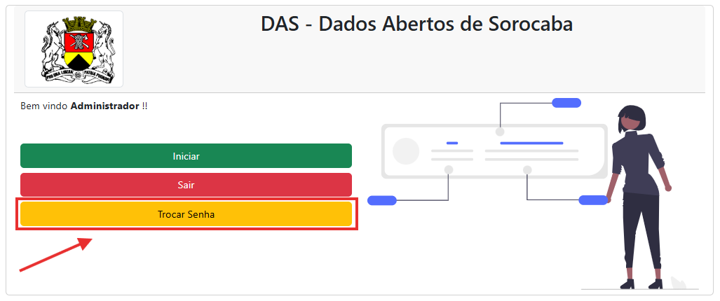 Para alteração da senha, clique no botão ‘Trocar Senha’ na tela inicial do sistema.