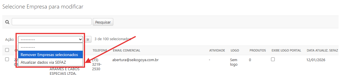 Selecione as empresas que deseja atualizar as informações e clique em ‘ir’.