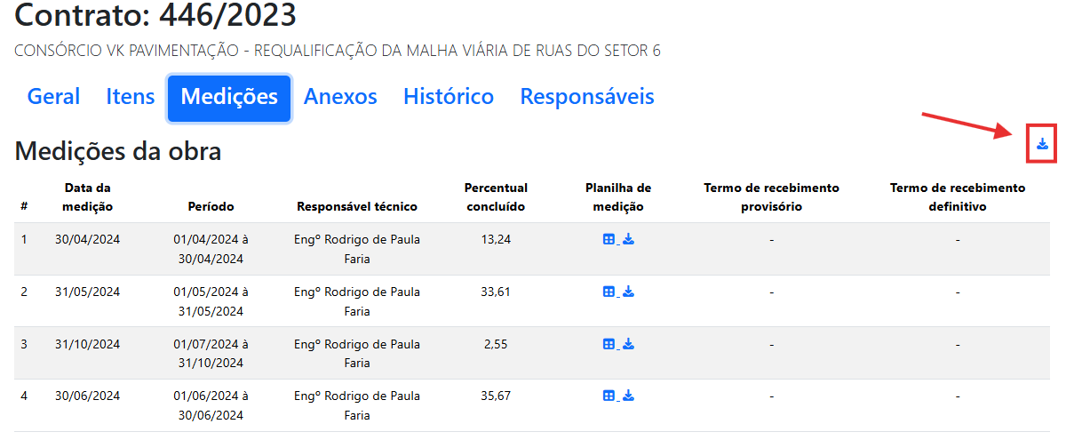 2.2.3 Nas medições do contrato, é criado o arquivo medicao_obra.csvcsv, e as planilhas podem ser baixadas individualmente.