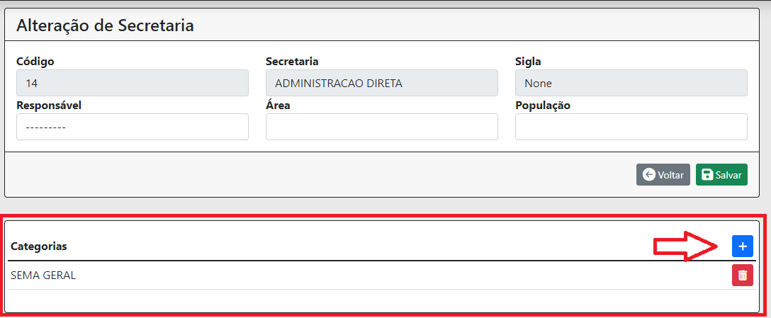 Imagem 12 – tela de cadastro de secretaria com a categoria