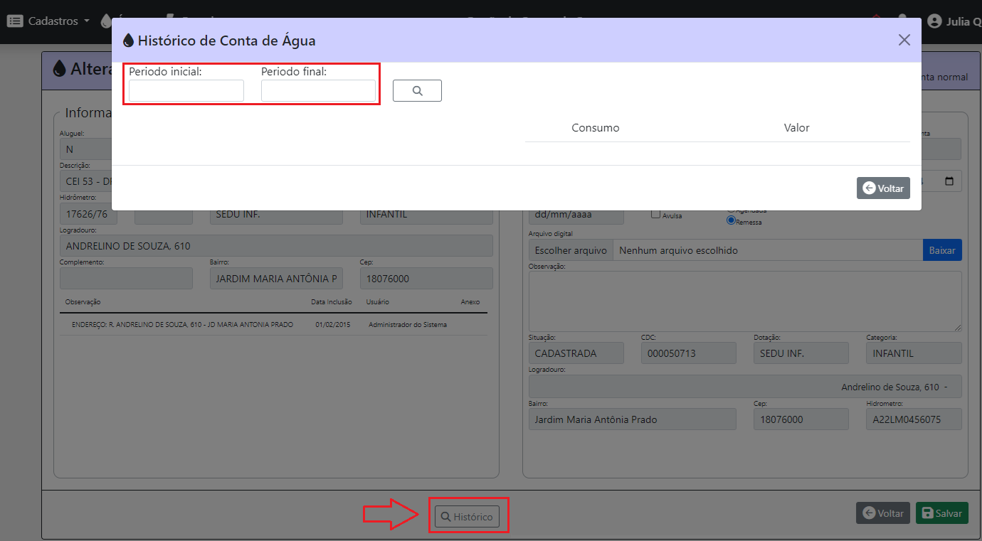 Imagem 25 – tela de cadastro de contas de água botão ‘$’