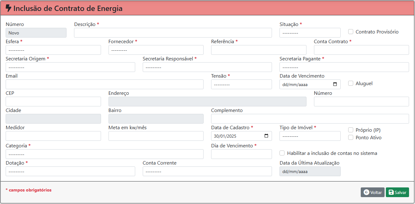 Este cadastro possui as informações do contrato, os campos indicados com asterisco são obrigatórios.