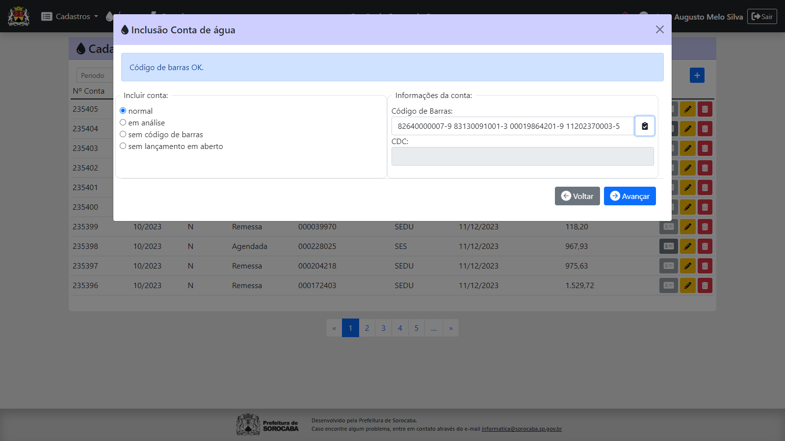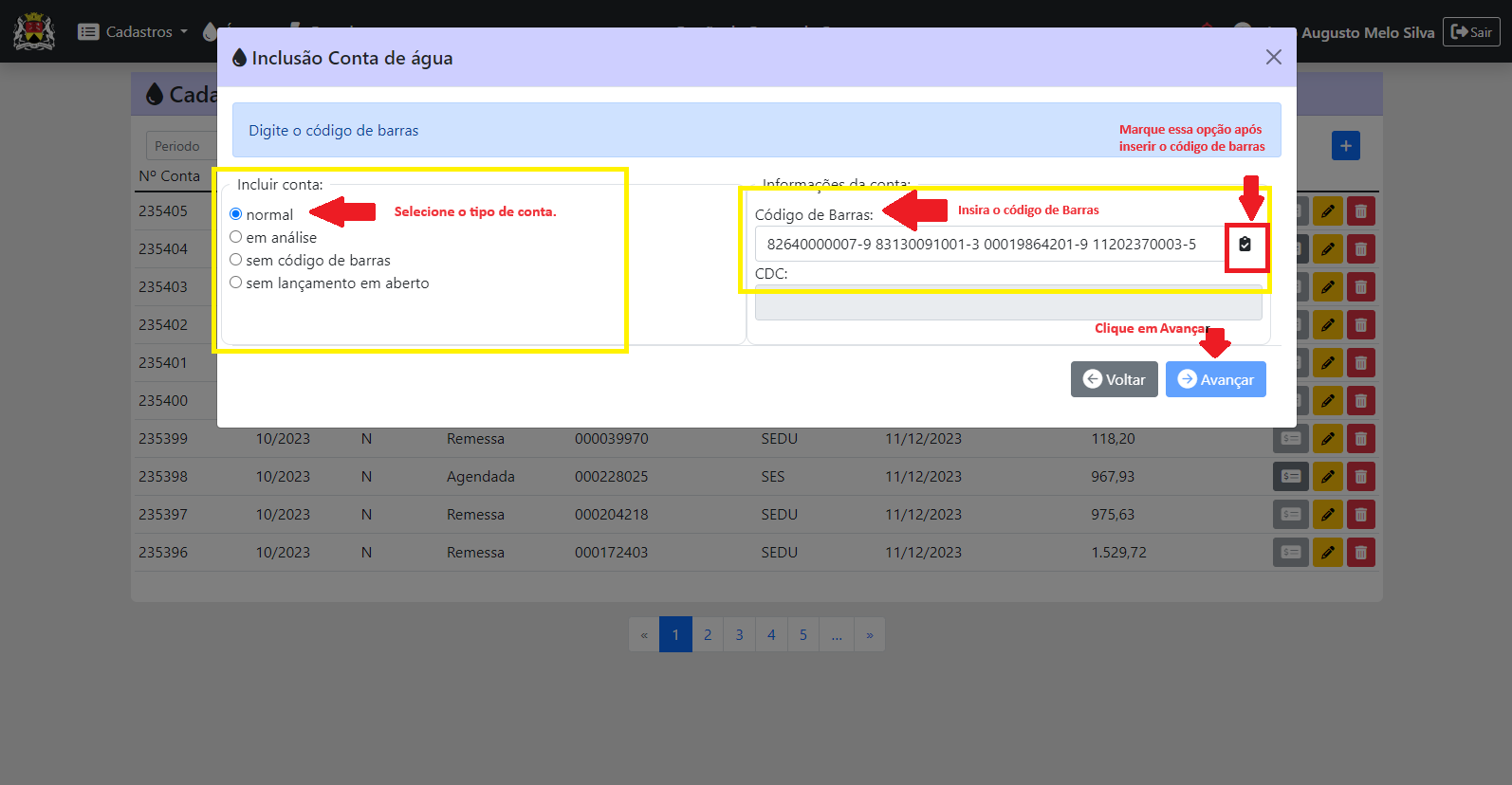Para Inclusão de Conta de água:gua ou energia: Selecione o tipo de conta como no exemplo conta normal, essa deverá conter o código de barras, digite ou copie e cole o código de barras no campo Código de Barras, feito isso Selecione o ícone de checking para que o mesmo fique marcado, Clique em Avançar.