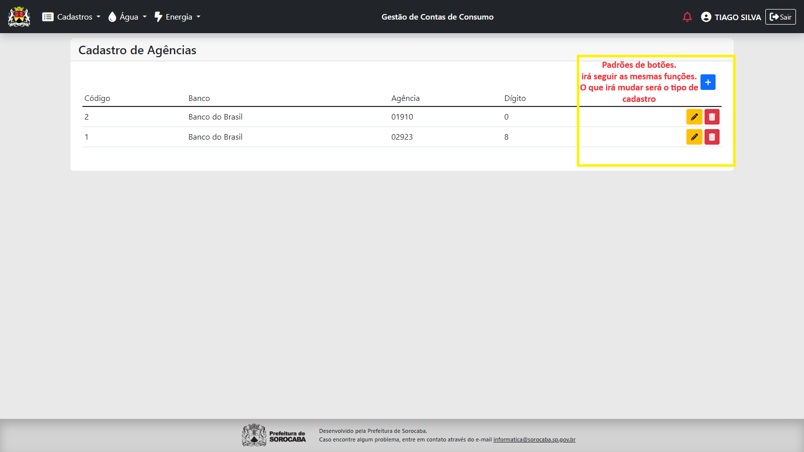 Adicionar, Editar ou Excluir: O padrão para se adicionar, editar e excluir seguirá basicamente a mesma coisa, Botão + em azul adicionar novo cadastro , Botão em Amarelo permite a edição e o Botão em Vermelho Excluí o Cadastro Desejado.