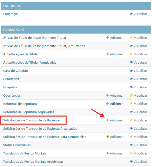 Para registro de uma solicitação de transporte de paciente, procurar a opção “Solicitações de Transporte de Paciente” e clicar em Adicionar.