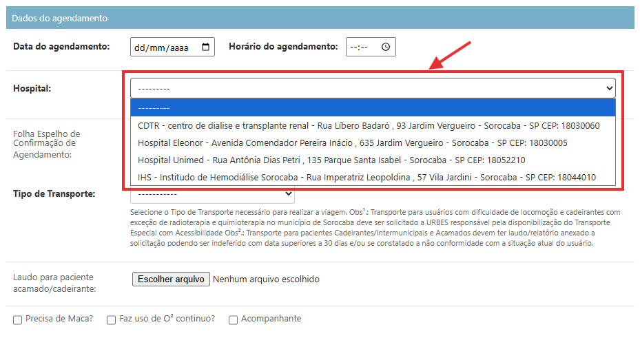Na solicitação de transporte de pacientes para hemodiálise, os hospitais onde o procedimento será realizado estão pré-cadastrados, junto com os respectivos endereços.