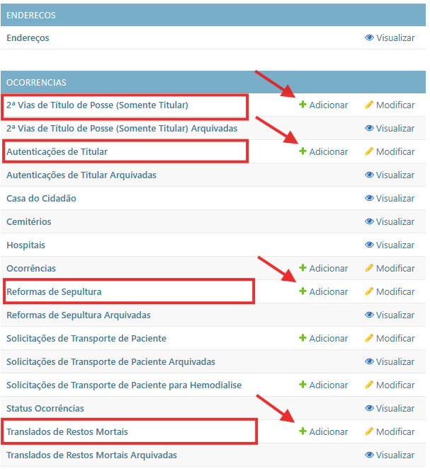 Opções para solicitações referentes aos cemitérios. As funcionalidades disponíveis são:
