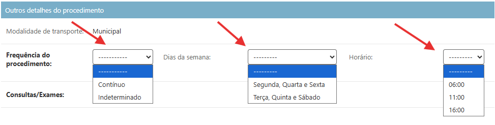 - Frequência do procedimento: Indicar se a frequência do procedimento para o qual o paciente precisa de transporte é Esporádica ou Contínua