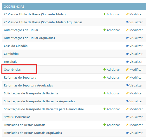 O perfil de gerente também pode realizar atendimentos. Para isso, clicar em Adicionar na opção Ocorrências.