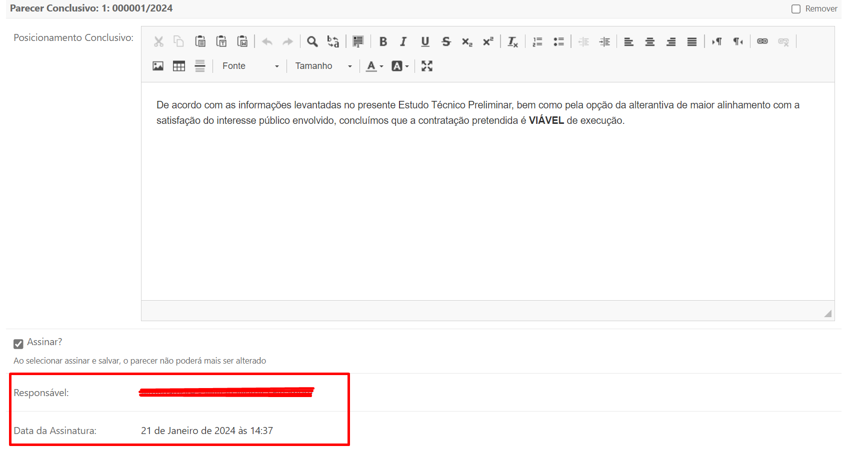 - Incluir/Alterar Parecer Conclusivo em Estudo Técnico Preliminar