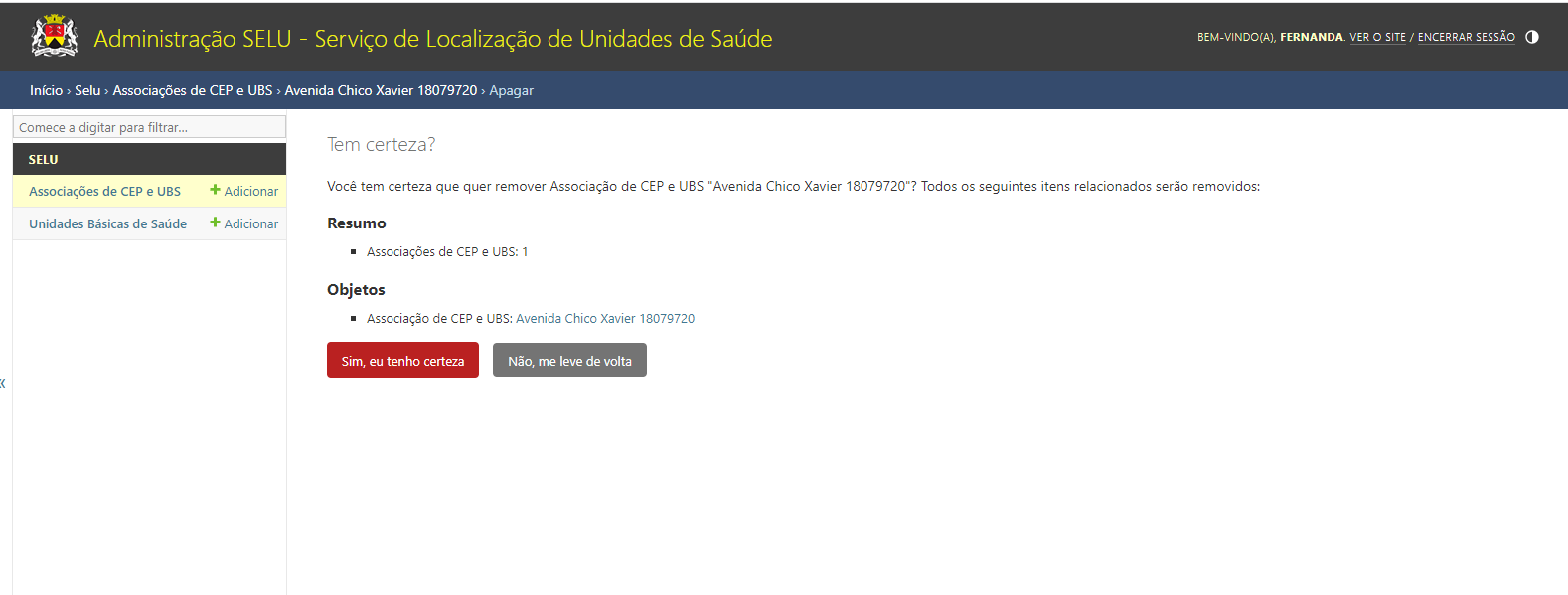 Aparecerá uma mensagem de confirmação da exclusão. Se desejar excluir, confirme em “Sim, tenho certeza ”ou se não deseja excluir, clique em “Não, me leve de volta”