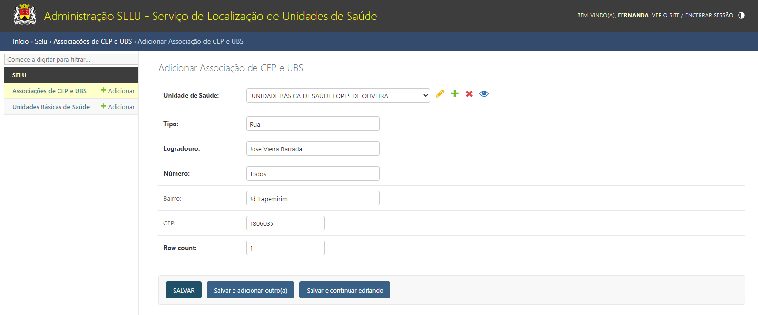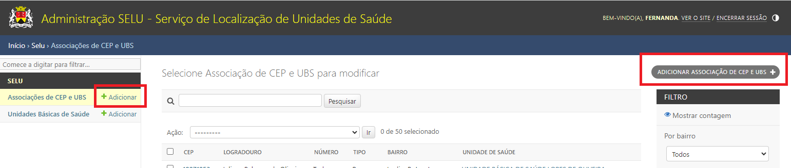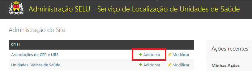 Na tela inicial Administração do Site, Associações de CEP e UBS, clique em adicionar