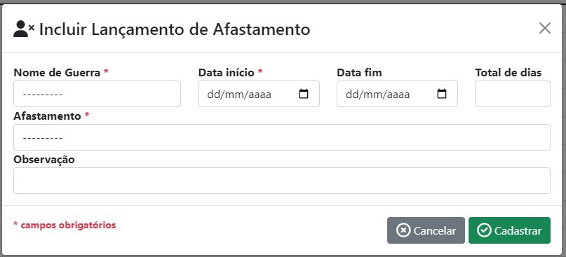 - Não é permitido incluir uma ocorrência de afastamento com a mesma data início para o mesmo funcionário.