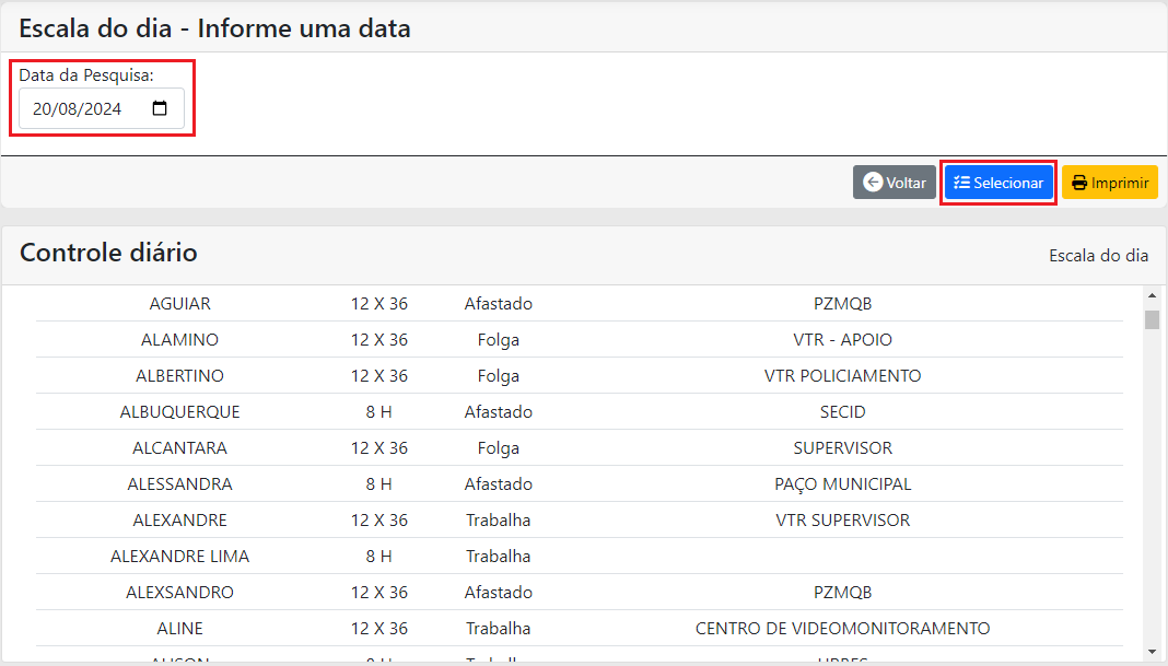 Após informar uma data e clicar em 'Selecionar', o sistema exibe os dados na tela, é possível visualizar os guardas ativos no dia.